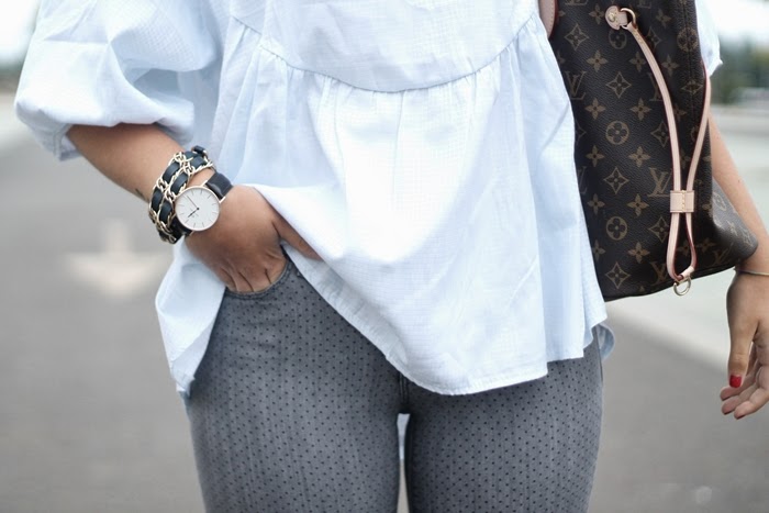 OASAP blouse, ZARA pants, LOUIS VUITTON Neverfull MM bag, ADMA pearl necklace, DANIEL WELLINGTON watch, LOVELYPEPAXKRACK booties