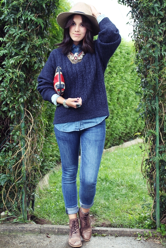 Hace ya un año que tenía ese jersey por casa, lo compré en el rastro de Lisboa cuando estuve de Erasmus, es super calentito y quien diría que por 0,50€ me llevaría un Massimo Dutti a casa… Decidí usarlo uno de estos días lluvioso, con mi camisa vaquera, mis botas de piel y mi sombrero. Para darle un toque, volví a sacar de armario mi Moschino, me tenía algo aburrida el año pasado, pero ya se me pasó esa tontería.