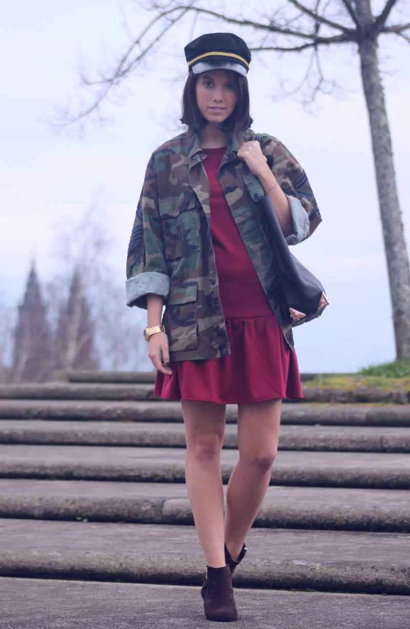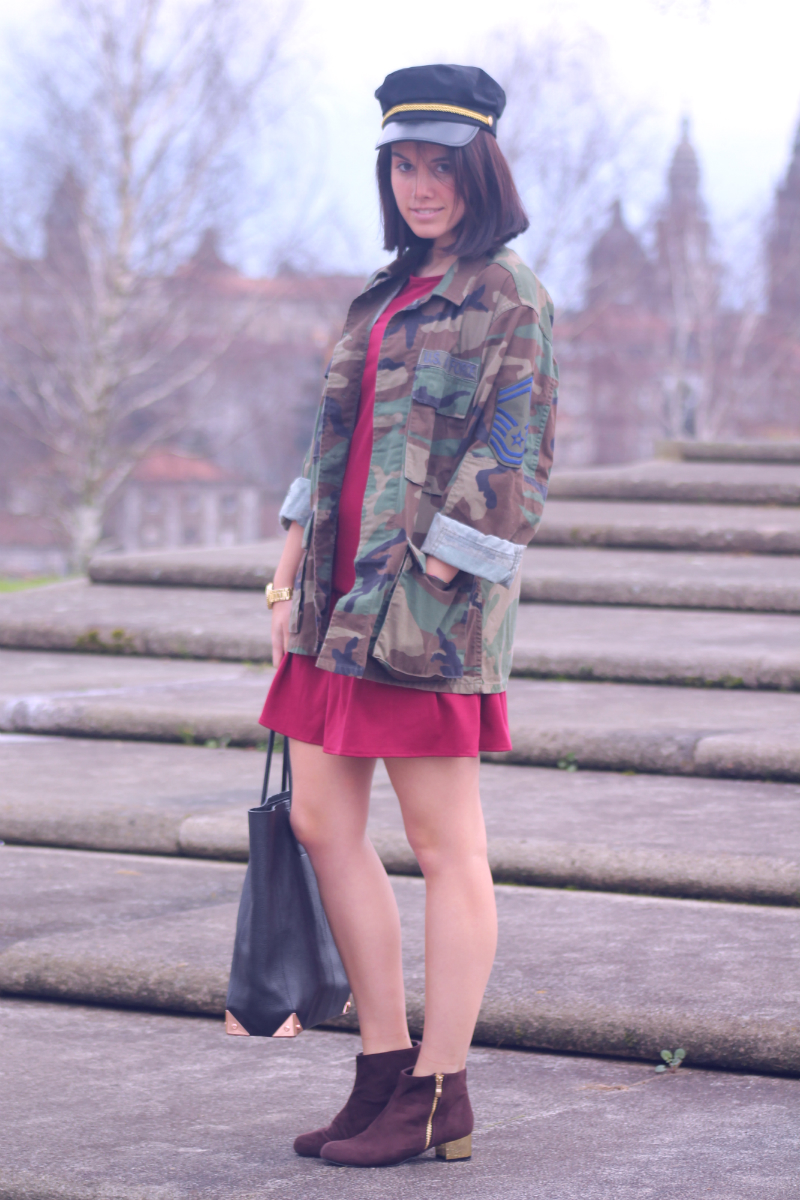 Me gusta mucho el toque ese diferente que le has dado al look mezclando el militar con el color del vestido! Por cierto la foto con el sombrero y la chaqueta que tienes de perfil me ha encantado! Espero verte por mi blog, un beso y feliz fin de semana! xxx