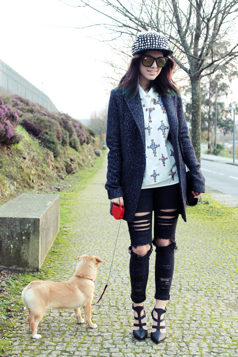 ¡Feliz semana! Os enseño mi blusa de Sheinside llena de cruces por delante y por detrás, a los cuellos le puse unos picos de calaveras que me cogí en Ebay, y al ir de paseo con Cuqui decidí ir con mis vaqueros favoritos de Wholesaledress, mis nuevos tacones de Gina Tricot que son comodidad pura y le dí mi toque personal con la gorra.