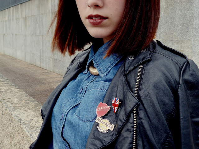 Me mola mucho el rollo british, muy de los ’80, con la denim abrochada hasta arriba y la minifalda. Y los pins. ¡¡Molan mucho!!