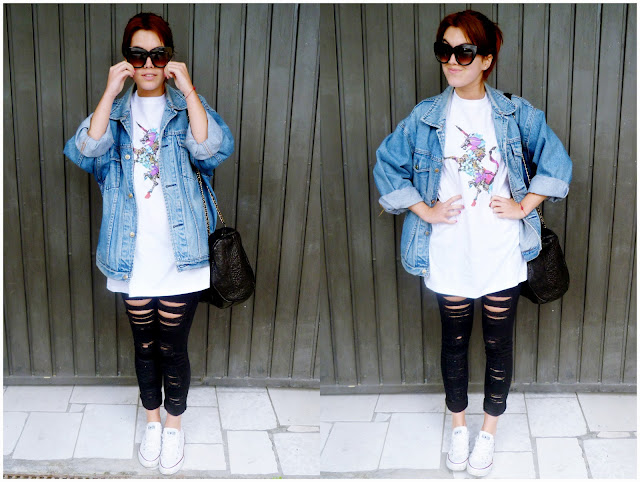 Hoy os enseño un look informal y muy mío, así es como suelo ir vestida los días que voy a la universidad, unos jeans, camiseta, cazadora y converse o superga. Pero este look tiene algo de especial, y es la camiseta que llevo, imagino que todos conoceréis a Audrey del blog BeFrassy, pues esta camiseta está diseñada por ella, y podéis encontrarla en FrassyRags en tres modelos diferentes. Yo me decanté por el unicornio floral, aunque el cósmico tambié me gustó un montón. Es fantástica! Y las gafas han sido una ganga increíble contando con que es el nuevo modelo que le he visto a Nicole Richie 🙂