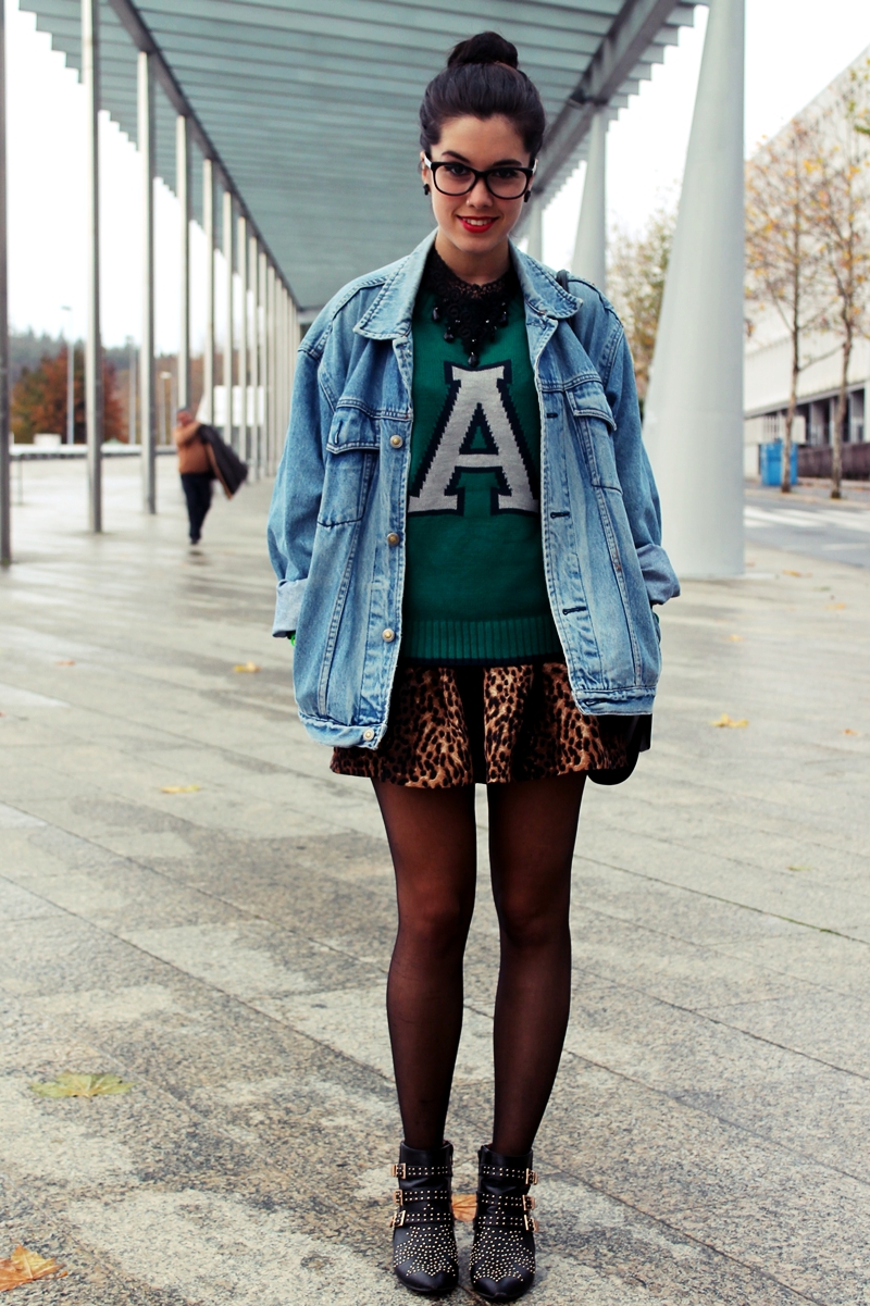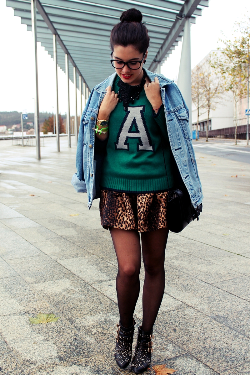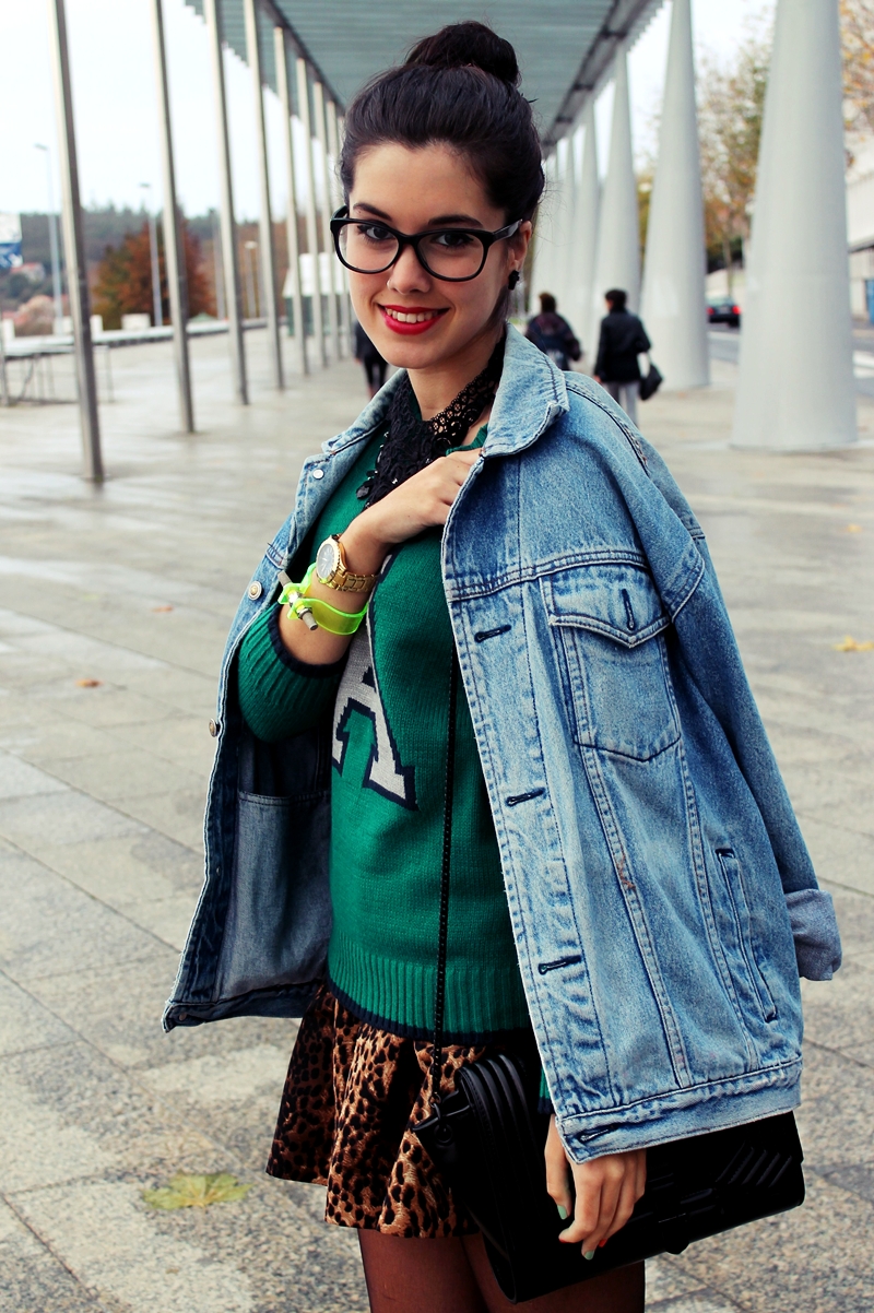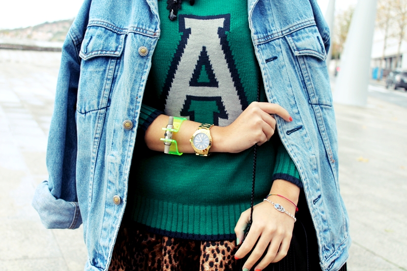 ZARA skirt and bag, LEFTIES sweater and necklace, VINTAGE jacket, COOEE neon bracelet, ASOS watch, LA PETIT MARIETA skull bracelet, TALLER DE POPPINS crosses earrings, GOJANE booties and FIRMOO eyeglasses