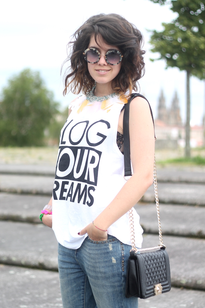 ¡Buenos días de miércoles! ¿Cómo han ido las rebajas? Hoy quiero hablaros de Nathnit, una marca creada por Natxa, ¿os acordáis que me realizó un dibujo super bonito de uno de mis looks? Podéis verlo aquí. Pues Natxa también realiza piezas de bisutería, tanto collares como pulseras,me ha enviado este collar de plumas y punto, y estas dos pulseras preciosas,cada pieza es única y tiene un montón de modelos, podéis verlos aquí. He decidido darles todo el protagonismo con un look muy simple, boyfriend y básica blanca, os presento también mi adorado clon del boy de Chanel, que es de Persunmall, y las bailarinas de Pilar Burgos que ahora están de rebajas. (Por cierto, las sandalias del look anterior están a 14€, y estas bailarinas también,consultad colores enviándoles un correo aunque no aparezcan los modeos en su web tienen stocks en sus tiendas físicas).