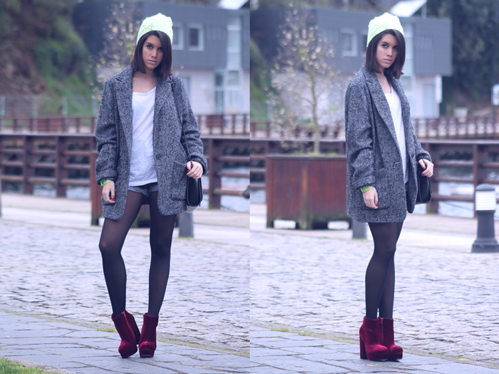 LEVI’S short, MANGO coat, PRIMARK beanie, ZARA bag, COOEE neon bracelet, STYLISTPICK Eleonora boots