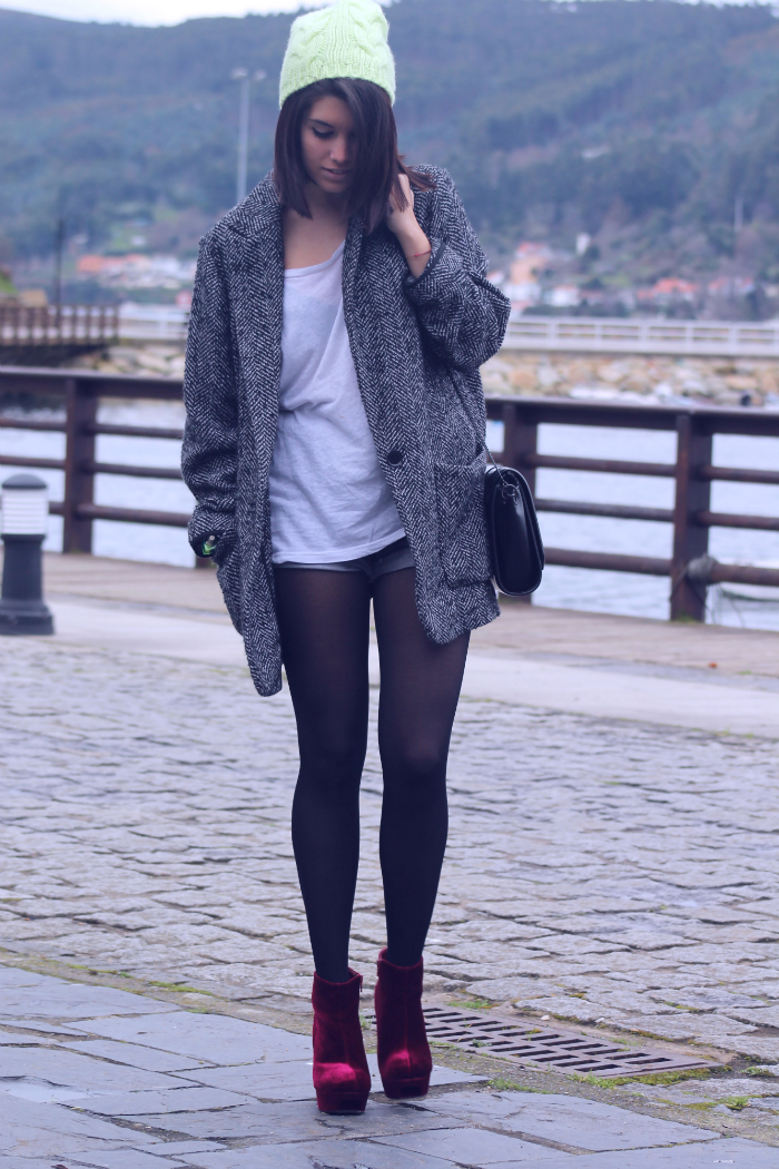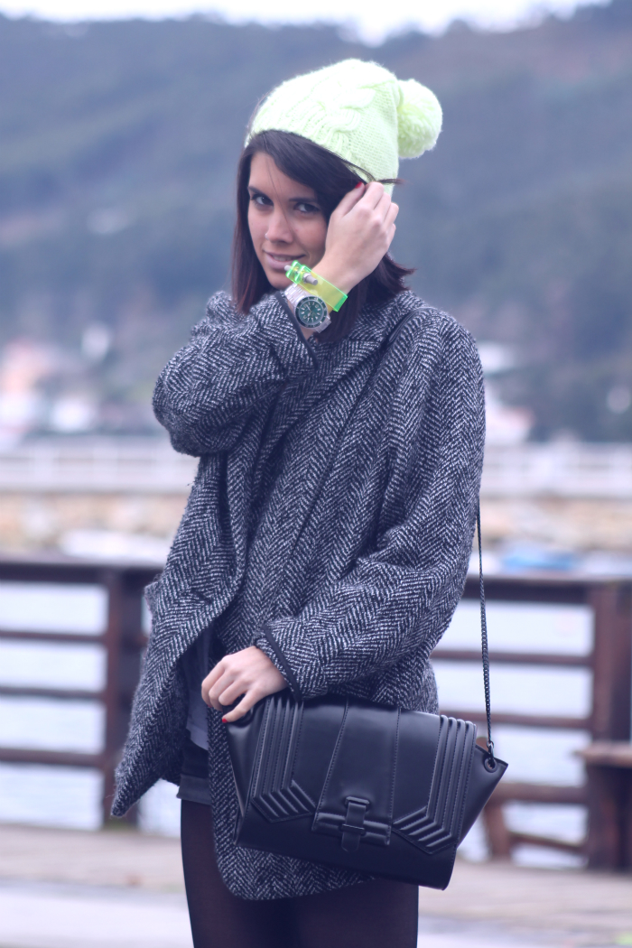 LEVI’S short, MANGO coat, PRIMARK beanie, ZARA bag, COOEE neon bracelet, STYLISTPICK Eleonora boots