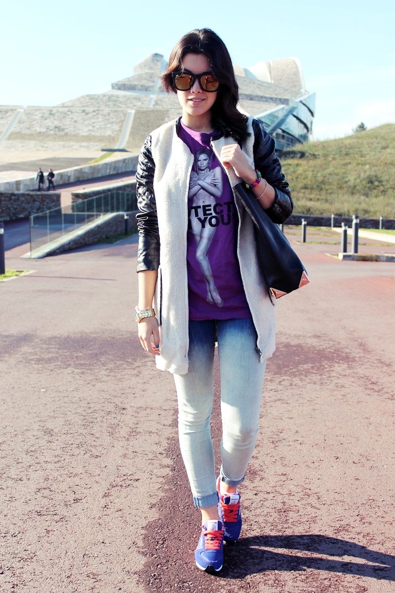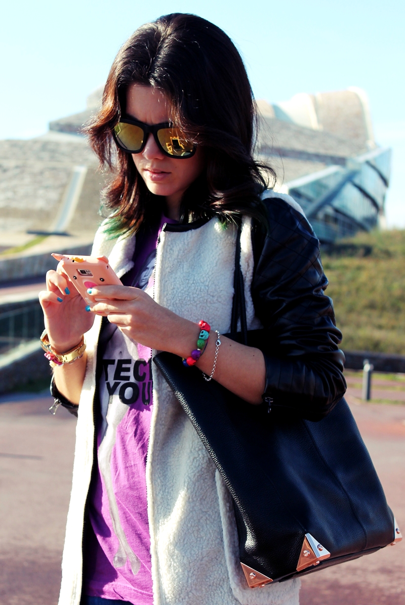 Que bonita camiseta! El abrigo tambien es super bonito y las gafas me gustan mucho, estas guapa guapa como siempre! Yo no me pondria ese tipo de zapas pero me gusta mucho como cambia el rollo del outfit!