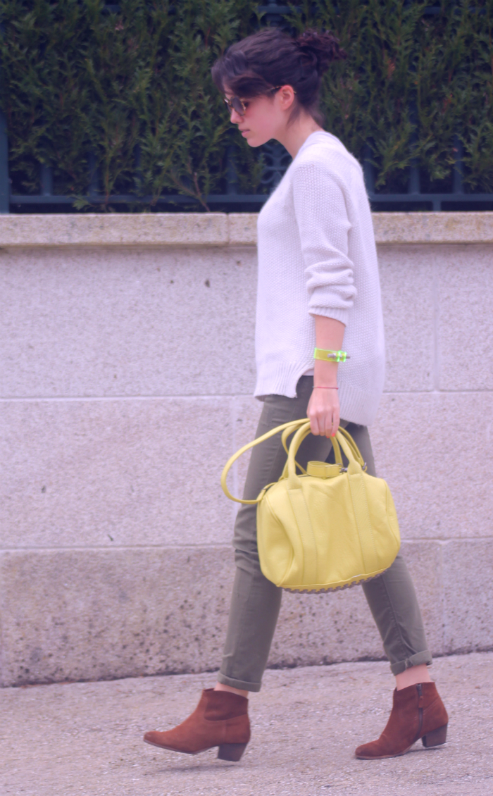 ¡Feliz lunes y feliz comienzo de mes! Hoy quería enseñaros mi nuevo bolso, siempre he tenido una obsesión terrible con el Rocco Duffel, se me han saciado las ganas con el tote prisma de Alexander Wang, sin embargo ese modelo de tachuelas siempre ha seguido en mi mente, y para mi sorpresa, Suiteblanco lo ha sacado esta temporada en color nude y amarillo limón, no lo dudé un segundo y se vino conmigo a casa. Hoy un look con colores otoñales, verde,beige y marrón, con el toque de color del nuevo bolso. Además os enseño mi nuevo tatuaje en la muñeca, para mí es muy especial, me lo hice este fin de semana y la verdad es que no me dolió nada, espero que os guste mucho el look de hoy, millones de gracias por vuestros comentarios taaan amorosos y por vuestras visitas diarias! Os dejo otro look muy cómodo en el blog de Amaya Lavid, nos leemos mañana con un post de clones! ^^