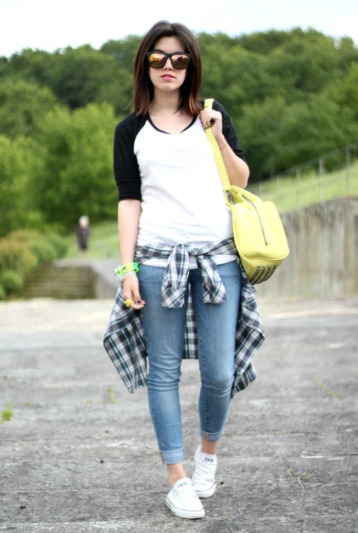 SUITEBLANCO bag, COOEE nutcuff bracelet, ZARA shirt and jeans, PRIMARK plaid blouse, EBAY sunglasses, CONVERSE sneakers, BIMBA&LOLA lips ring
