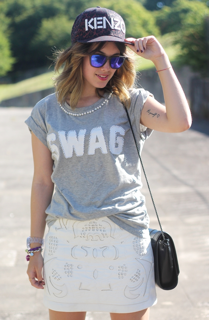 ¡Buenos días! Aquí estamos, mi rubio, mis Miu Miu y yo. Los que me seguís ya sabéis que tuve el pelo muy cortito, lo tuve pelirrojo, lo tuve negro, tuve las californianas y todo tipo de cortes. Sólo me quedaba ser rubia, no quería ser rubia platino, simplemente tener unas mechas en la punta, me las han puesto un poco altas ya que me crece super rápido el pelo y que así me aguante un poco más, todavía me estoy adaptando, me veo algo rara pero es cuestión de adaptarse supongo 🙂 Y vamos con el look de hoy, es un look sport, con una falda troquelada blanca que me tiene loca, decidí ponerle una básica gris con los detalles de las perlas y las deportivas de purpurina que le dan un toque de color, al igual que la gorra. Espero que os guste tanto como a mí el resultado! Os mando un beso enorme, y de verdad que muchísimas gracias por estar ahí, cada visita y comentario son una alegría constante!