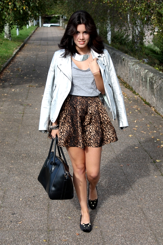 I’m really in love with my cat flats from Blink, that I bought in Asos, I’m really tired of spiked slippers.. Today I show you my print animal skirt, I really like it, and I wear it with my silver jacket very famous on blogosphere.