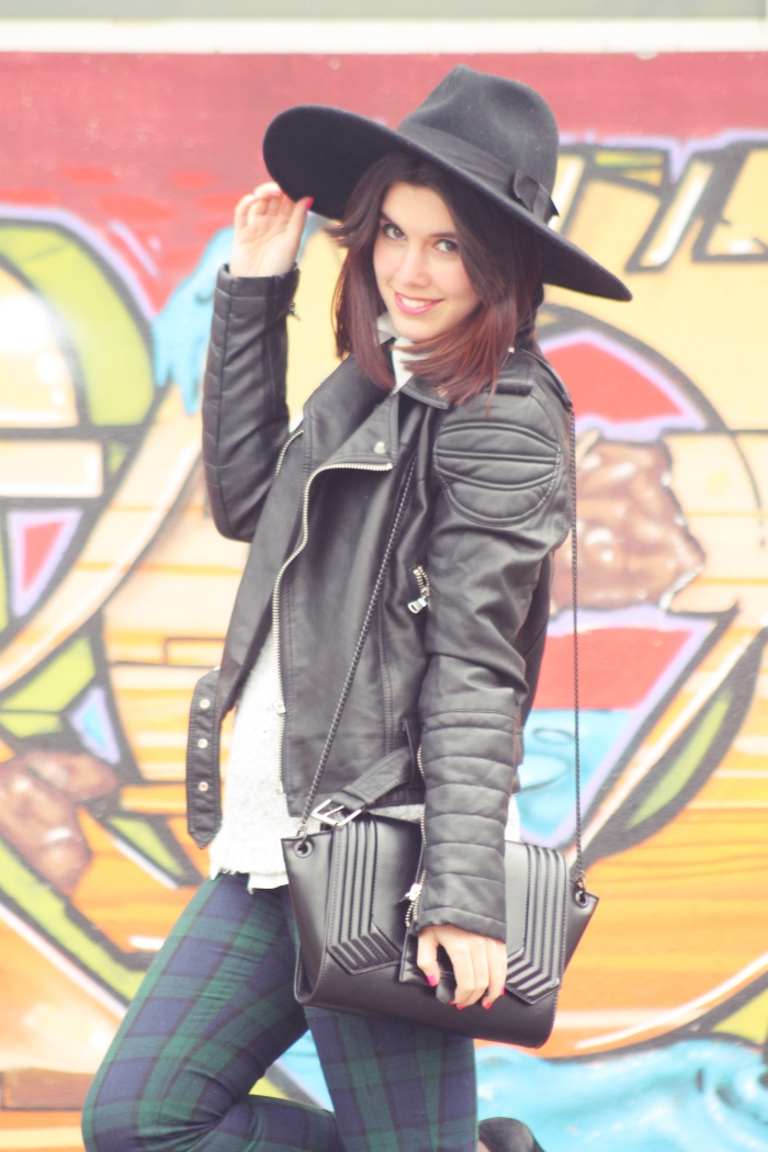 ¡Feliz sábado! Hoy os traigo uno de mis looks favoritos, los pantalones de cuadros ya me los habéis visto varias veces, me resultan muy cómodos aunque tengo que decir que me han sacado algunas bolitas. Los he combinado con una blusa de gasa y un jersey gris, y por encima mi biker negra. Tengo que decir que comencé el día con los tacones, pero a media tarde tuve que sacar a pasear unas bailarinas negras del bolso, cada vez tengo menos aguante :p