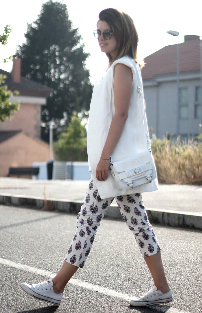 ¡Buenos días! Ya estamos a sábado, y con él os enseño un post con un nuevo look en el que el total protagonista es el color blanco. Un total white que resalta el estampado del pantalón y los complementos. Es un look sencillo y muy cómodo, pero no dejo de usar este chaleco blanco que da ese punto sofisticado a cada outfit. Muchos besos y muchas gracias por todos vuestros comentarios y visitas,